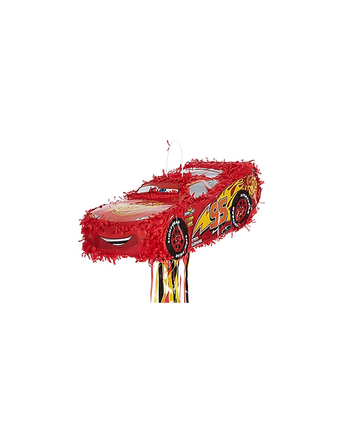 This pinatashaped like Flash McQueen, the iconic red racing car from Dysney Pixar's Cars, is a favorite at birthday parties! It features bright red color, yellow lightning bolts,black wheels, light bleu eyes on the windshield, and a big smiling mouth.
