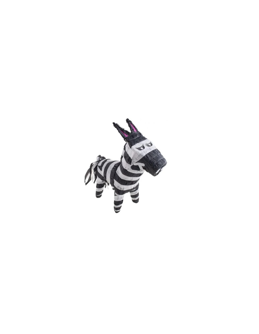 With its classic black and white stripes, matching fringe tail and purple-tinted ears, this pinata brings a fun and wild touch to any celbration.