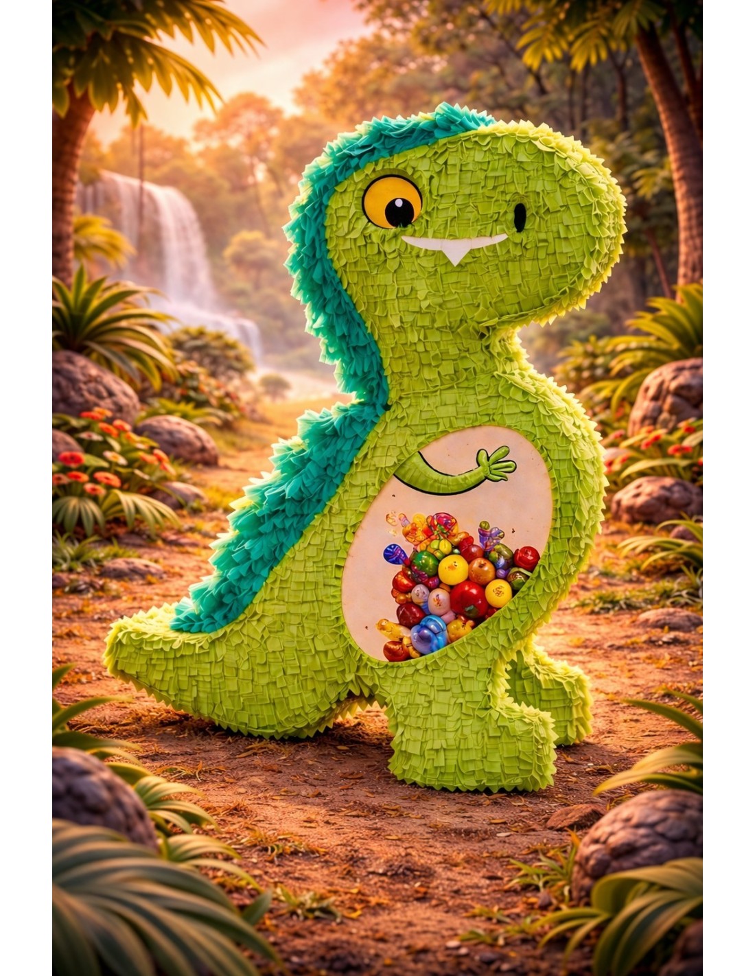 Un dinosaure prêt à rugir de bonheur... et de gourmandise ! Entièrement vert clair avec deux grandes bandes vert foncé sur le dos, cette piñata est décorée d'élégants motifs beiges en forme de bonbons sur les côtés. C'est l'accessoire indispensable pour tous les petits fans de jurassique !